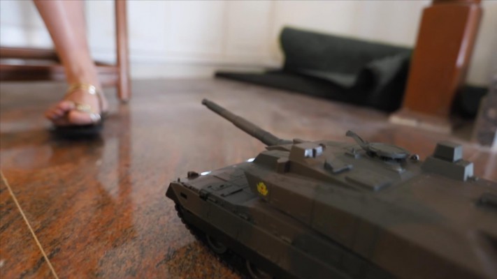 【内容简介】:麦可颂坐在椅子上 翘着二郎腿,突然出现了一辆玩具坦克,向她发起攻击。麦可颂生气地脱了鞋,裸足踩住坦克,在地上摩擦,并嘲笑它。接着站起来踩烂;踩烂到一半的时侯又穿上鞋子踩,最后彻底把玩具坦克踩碎毁灭了。