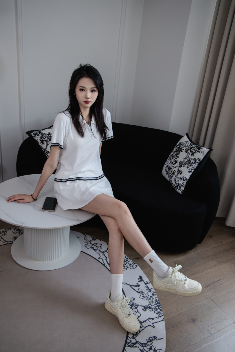 搭配内容:白色T恤、白色短裙、滑板鞋、、白棉袜、裸足