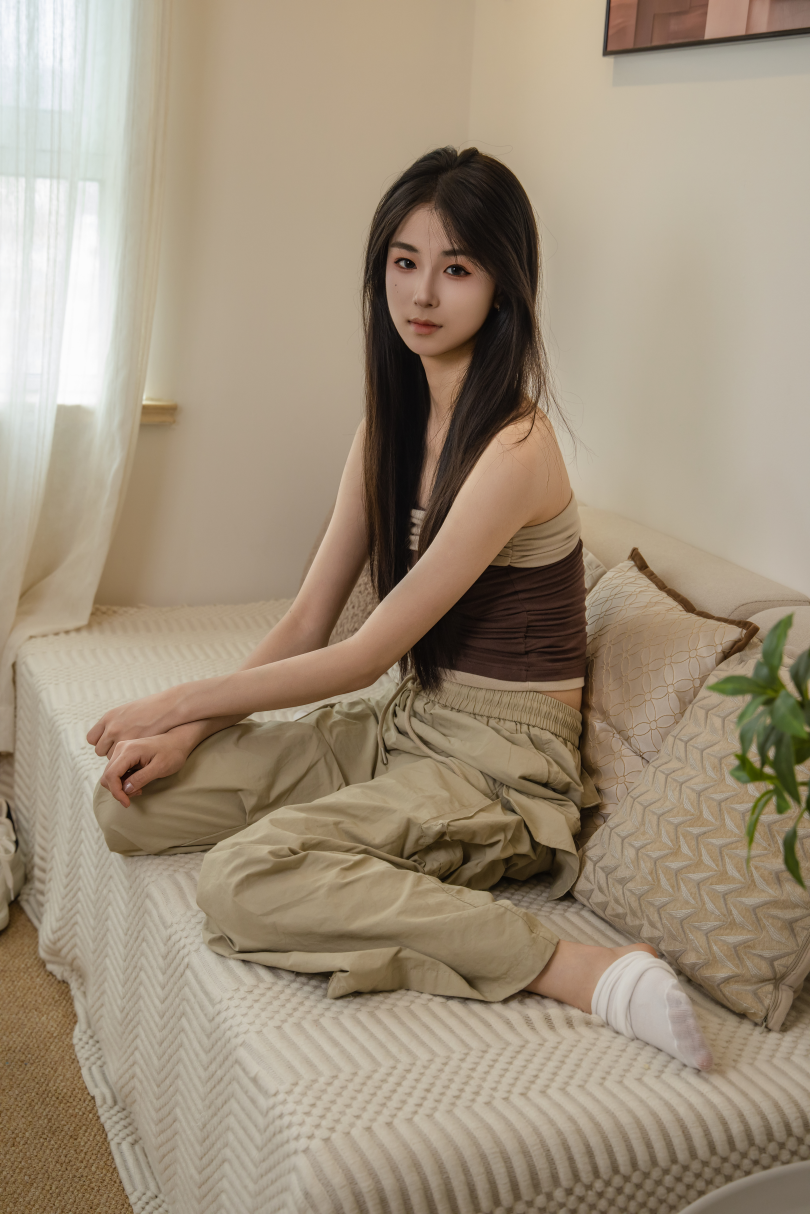 搭配内容:棕色抹胸、工装裤、白棉袜、滑板鞋、裸足