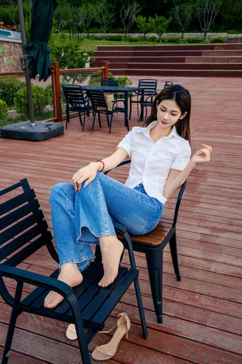 › 足愉心摄影第48期:模特沐晴(搭配:白衬衣、牛仔长裤、肉色丝袜、浅色高跟鞋)
