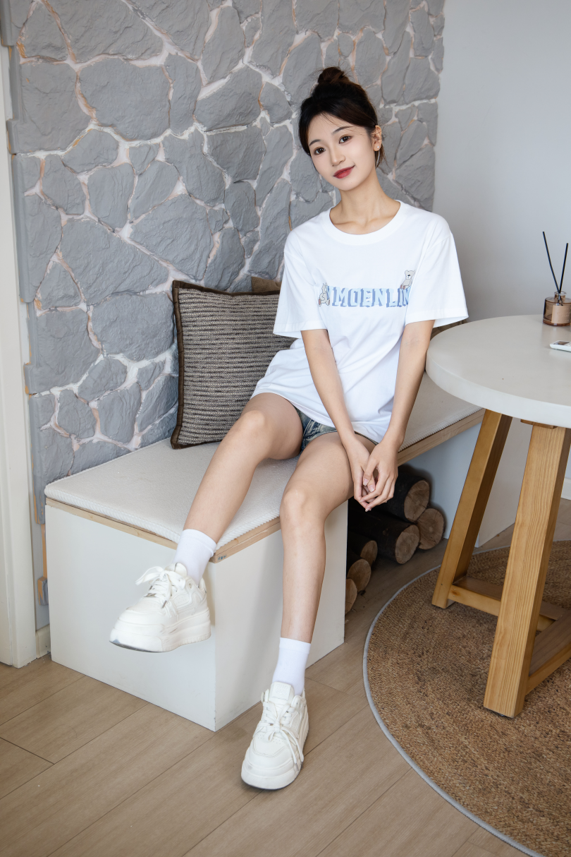 足愉心摄影第64期:模特伊伊(搭配:白色体恤、牛仔短裤、运动板鞋、白色棉袜、裸足)