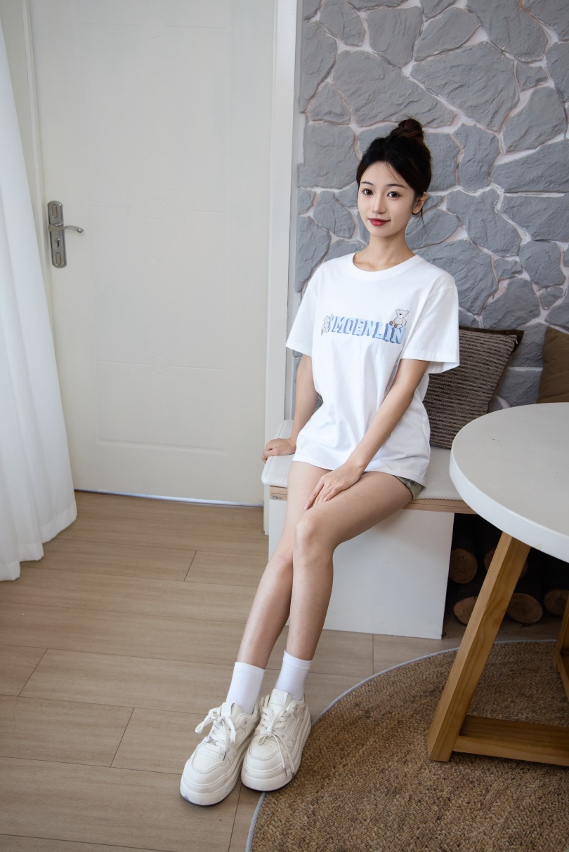 搭配内容:白色体恤、牛仔短裤、运动板鞋、白色棉袜、裸足