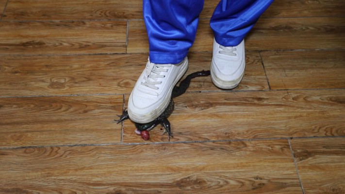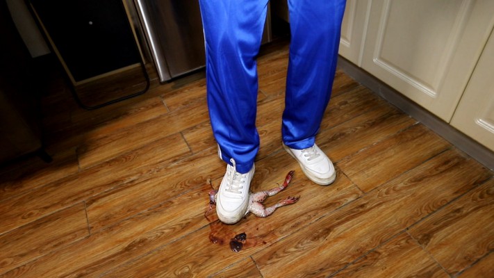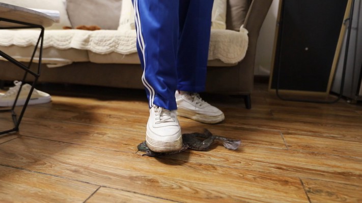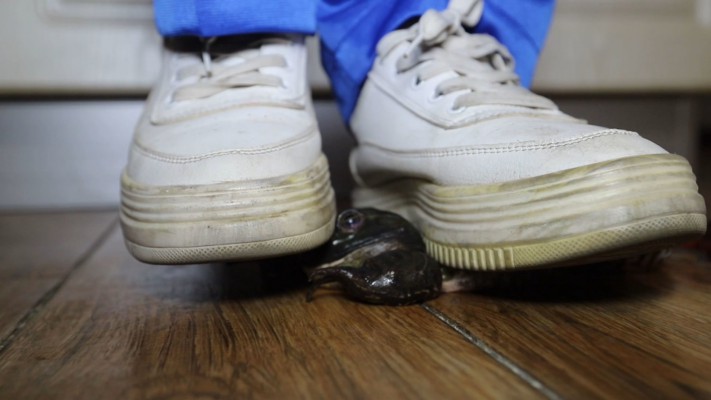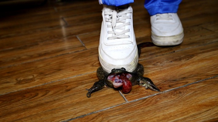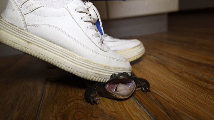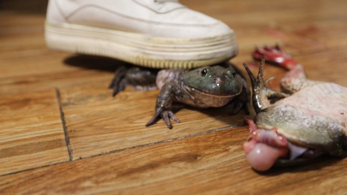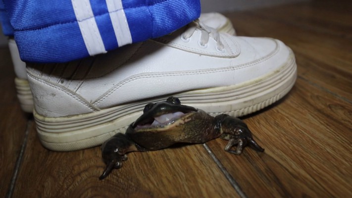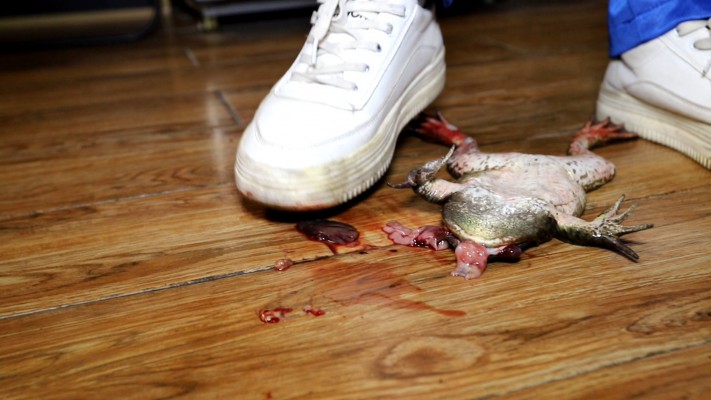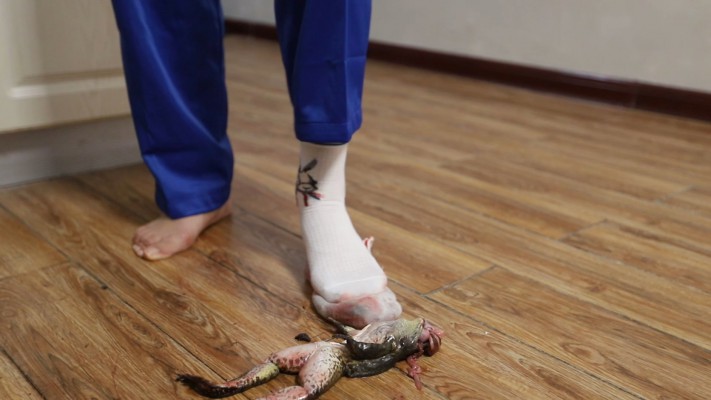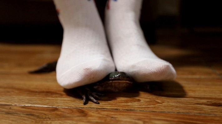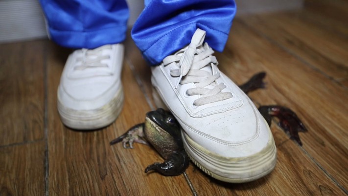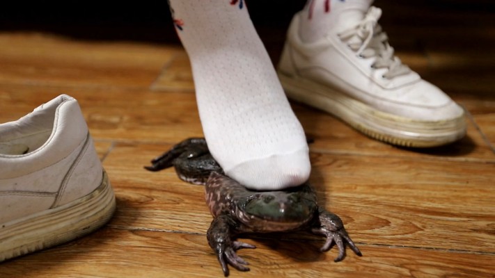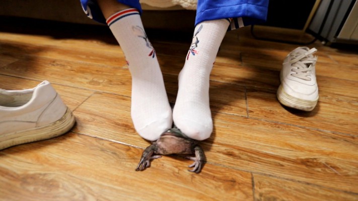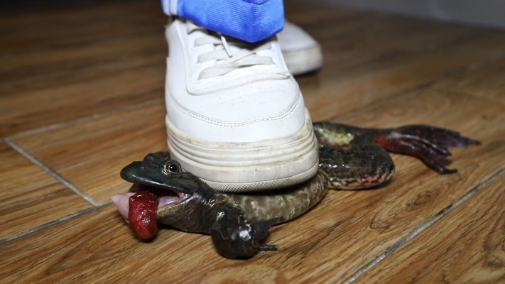 傻白甜女生栗子穿着体育课的臭臭小白鞋穿鞋踩死一只牛蛙,再脱鞋把一只牛蛙塞进袜子里踩到渗血内脏都踩出来啦