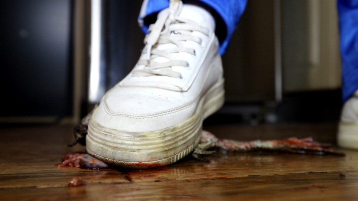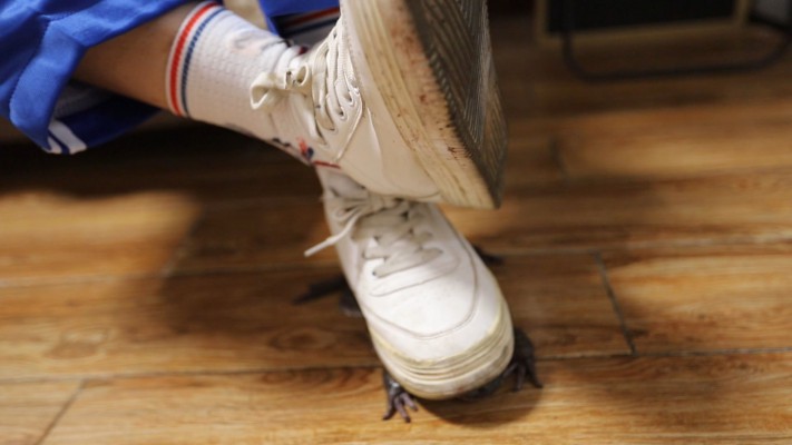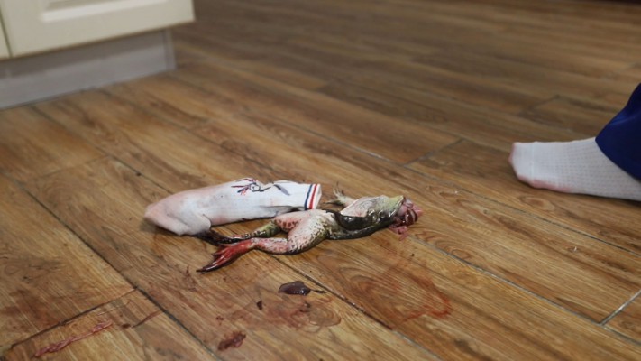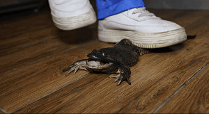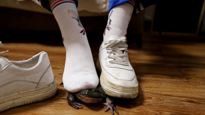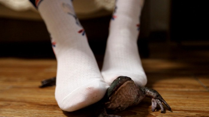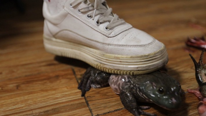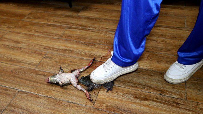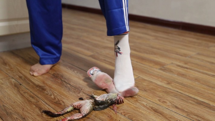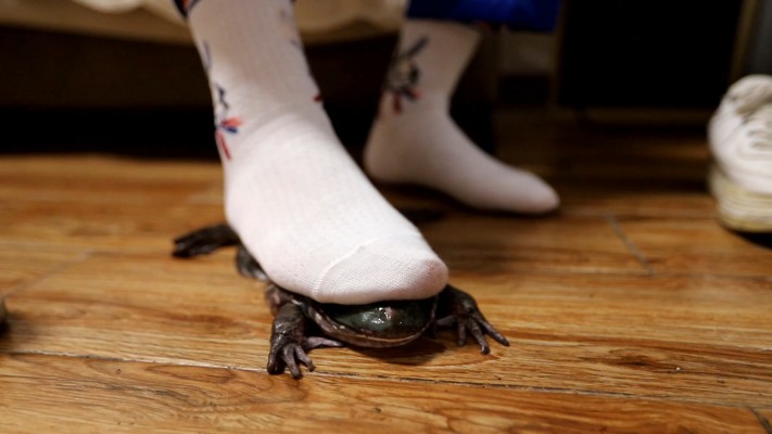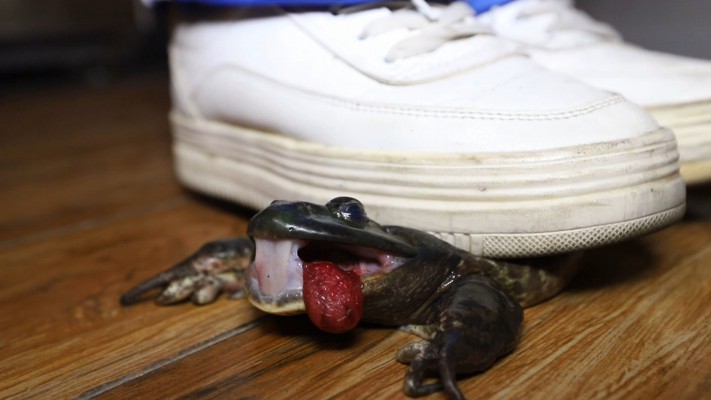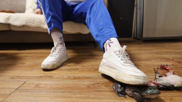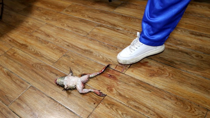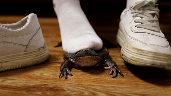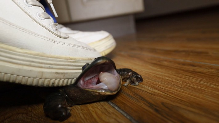 傻白甜女生栗子穿着体育课的臭臭小白鞋穿鞋踩死一只牛蛙,再脱鞋把一只牛蛙塞进袜子里踩到渗血内脏都踩出来啦