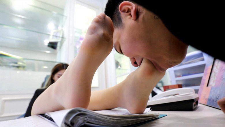 张悦换好了衣服到刘总家,刘总正在浴缸泡澡,于是张悦开始用脚挑逗他。刘总忍不住脱下张悦的高跟鞋开始舔脚,还撕开了丝袜舔。