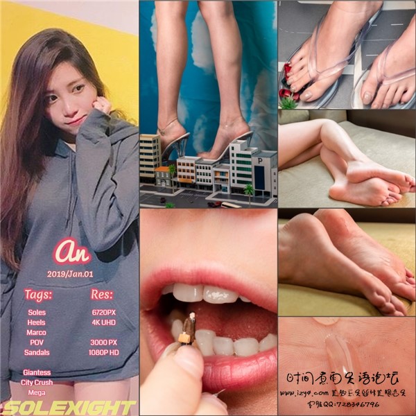 如果要做一個Solexight的美腳排行榜,An完美的腳型,性感的趾甲,絕對是名列前茅的人選之一。其實還未與An見面之前,只知道An的長相,但是當他脫下鞋子的那一刻,真的是讓人嚇了一跳,腳趾甲上的光澤,修長的腳型,看得出平常有多麼注重保養。事不宜遲,馬上請她穿上事前準備的透明夾腳拖與透明高跟鞋,整體的畫面真的堪稱絕美,整個足部搭上美麗的腳趾嶄露無疑,這次作品使用微距鏡頭特寫,您可以在最佳的畫質之下觀察An足部的一絲一毫。除此之外An的美腿也不落人後,預覽圖上的幾張照片就是最好的證明,當然重頭戲還是GTS系列的部分,飽滿的甲床,突顯了人物的渺小,十足的壓迫感以及強烈的對比還有與建築物的互動,是這次作品最大的特色,總體而言An是一部全方位的作品,雖然檔案容量不大,相信還是能讓人看得津津有味。